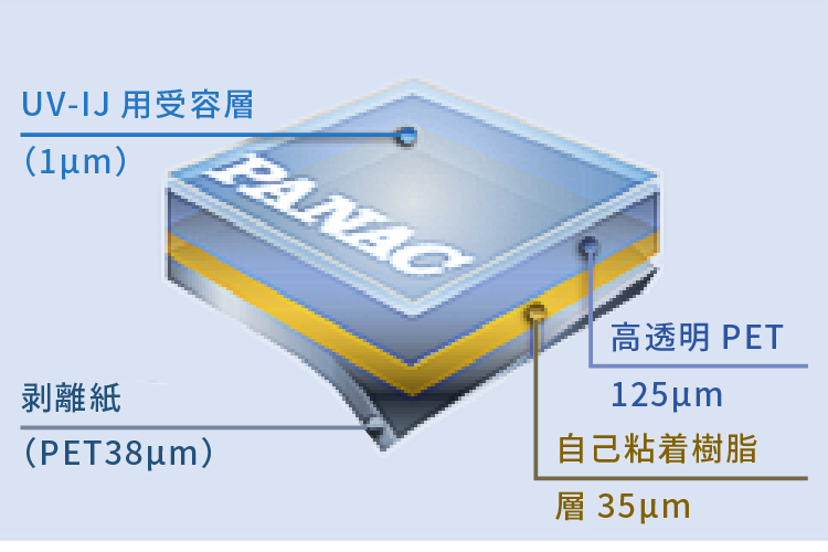 UVインク対応の再剥離の自己粘着PETです。透明度が高く、ガラス装飾に最適。